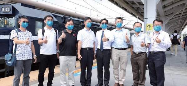 ▲(左3起)臺東縣副縣長王志輝、臺鐵局副局長朱來順、雄獅旅遊總經理黃信川、屏東縣交旅處處長黃國維、墾丁國家公園管理處處長林文和、臺鐵局附業營運中心總經理陳文川,與貴賓合影,於10╱18藍皮解憂號記者會。