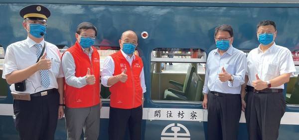 ▲(左2起)交通部部長王國材、行政院院長蘇貞昌、屏東縣長潘孟安、臺鐵局局長杜微,於10╱23藍皮解憂號首航典禮。