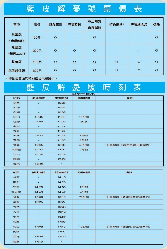 載滿許多人通勤回憶、備受鐵道迷喜愛的藍皮普通列車 2020 年底正式停駛,轉型 為臺鐵局懷舊「藍皮解憂號觀光列車」,經過10個月的整裝及復舊,在10╱23正 式啟航,每日往返行駛枋寮與臺東來回1趟次,單程最低票價299元起,即日起於 官網販售,預料將繼美學觀光列車「鳴日號」之後,再度引發一陣鐵道旅遊旋風。