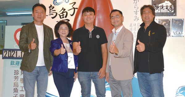 ▲(左起)台灣入境旅遊協會理事長王全玉、高雄市觀光工廠協會理事長陳秀卿、珍芳烏魚子見學工廠業務經理林威廷、觀光工廠促進協會理事長許立昇、台灣旅行業國民旅遊發展協會創會理事長朱永達。