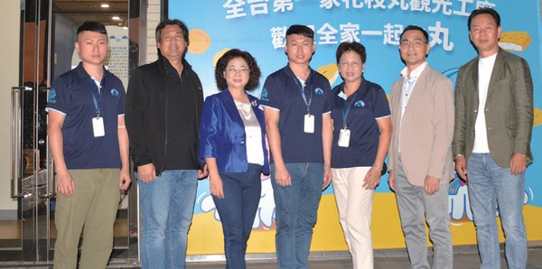 ▲(左起)宏裕行花枝丸館業務經理林資智、台灣旅行業國民旅遊發展協會創會理事長朱永達、高雄市觀光工廠協會理事長陳秀卿、宏裕行花枝丸館館長林資閔、總經理陳雙香、觀光工廠促進協會理事長許立昇、台灣入境旅遊協會理事長王全玉。