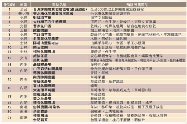 如多次在今年各大旅展展現多元魅力的「農遊超市」,便 將於現場推出「農遊888最高8折再打8折」,「農場住一晚降 價1,000再送1,000」,以及「農場玩一天4人同行1人免費」, 為吸引民眾前來,現場攤位將販售茶葉、新鮮蔬果、草莓加 工品、乾燥花卉及在地農家伴手好物等,並祭出各式社群打卡禮,讓整體市集更添互動趣味。