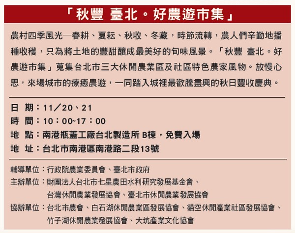 看好國旅市場即將再度迎來爆發的階段,財團法人台北市七 星農田水利研究發展基金會、台灣休閒農業發展協會及臺北市 休閒農業發展協會將於11/20、21假南港瓶蓋工廠台北製造 所B棟舉辦「秋豐。臺北好農遊市集」活動,屆時將集結台北 市農會、白石湖休閒農業區發展協會、貓空休閒產業社區發展 協會、竹子湖休閒農業發展協會及大坑產業文化協會等各區業 者,共21個市集攤位,齊力展示台北市精彩農遊魅力。活動現 場將同步宣傳台北市內休閒農業區好吃、好玩、好所在,藉由 體驗式的活動安排,來了解農村生態、自然環境與人文活動, 兼具休閒、教育、觀光的農旅正夯。