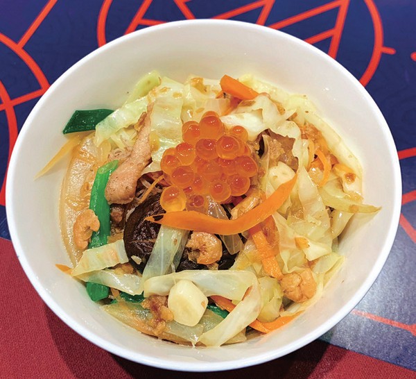 米粉選自霧峰在地小農的100%純米米粉, 帶著質樸的稻穀色澤,口感Q彈,將米香完 整封存。以傳統式焗炒的方式,將各式配 料炒鮮香味美,加上米香濃厚的米粉,盛 盤時,再撒上粒如紅寶石色澤的鮭魚卵, 讓味道和視覺更添增美感。