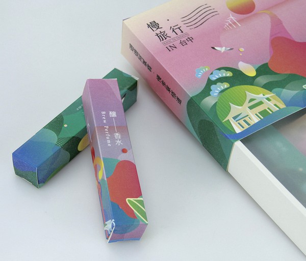 分別以霧峰農會酒莊「初霧清酒」、「當初荔枝蜂蜜酒」 以及台中市花山櫻花作為香水基底,調配出「初-香水」 及「釀-香水」兩種霧峰香氛,新型態的伴手禮讓旅客透 過香味喚起旅途的過程中所經歷的人、事、物、環境與人 文背景。初-香水 TRUE_ Perfume:翱翔黑翅鳶視角,引領 我們感受台中霧峰香米金黃稻浪與香氣;如鳶般振翅飛出 你的日常,循著大甲溪向前探索這一片自然森林,如神中 勇者的化身,輕盈的跳躍在迷霧中,從不輕易的出現在世 人之中,低調的華麗默默的守候,如夢似幻的隱居森林之中。
