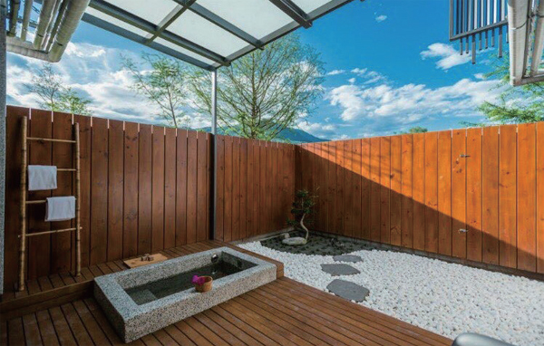 作為稱頌最夢幻的溫泉旅宿,在松邑莊園裡,設有山嵐、松 岳、仰松、合樂等客房選擇,不僅房間都能享受到泡湯的 樂趣,頂樓更有星空湯屋,讓住客們盡情體驗知名的「黃金湯 泉」。由於該區域的泉質屬於氯化物的碳酸鹽泉,富含鐵、鋇等 礦物質,氧化後會在表面形成黃褐色的結晶「湯花」,是深受日 本皇室貴族所青睞的「御泉」。值得一提的是,松邑莊園不只有 黃金湯泉,更有涼泉(泳池),因為追求自然的緣故,游泳池也 特別使用乾淨的山泉水,讓旅人們從暖到涼任君挑選。