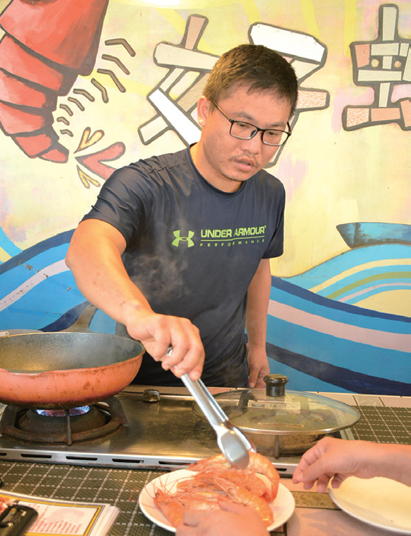 ▲好蝦冏男社負責人李富正不只善於養蝦,也會教客人用最簡單的方式烹調出美味的蝦料理。