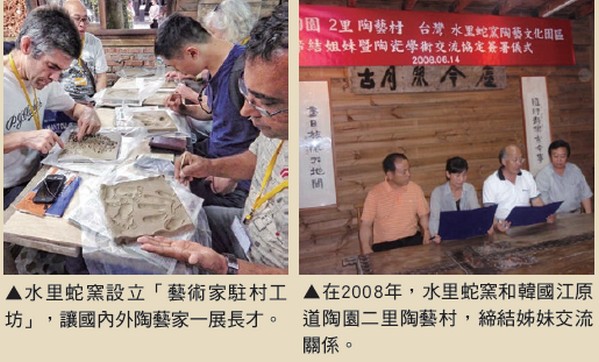 水里蛇窯受到國際矚目的實證不只一 樁,在2008年,水里蛇窯正式申請獲准加 入聯合國教科文組織(IAC),並於同年6 /14和韓國江原道陶園二里陶藝村,締結 姊妹交流關係。這是台灣第一次由民間陶 藝文化園區,與國外官方陶藝文化園區進 行正式相互技術與學術等合作。其實水里 蛇窯能有此成功的文化外交成績並不是一 朝一夕可得,水里蛇窯從事陶藝推廣教育 活動已有26年歷史,也曾舉辦過8次國際 及國內陶藝研討會,已是台灣陶藝文化保 存之珍貴活教材。林國隆更是向下紮根, 在朝陽科大工業設計系、南開科大文化商 品設計系、中興大學生物產業管理學系、 亞太創意技術學院文化創意產業研究所、 茶陶創意研究所任教,也開放大專生來水里蛇窯實習,達到產學合作。