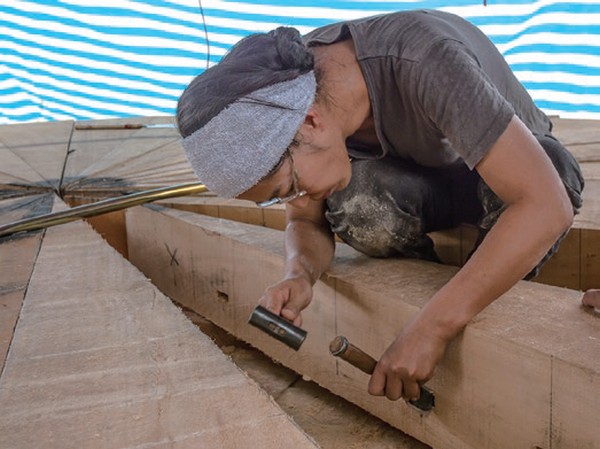 素材: 一顆珠子直徑約 60 厘米。盡可能使用被沖上海灘 的浮木。並利用電鋸、切片、海水浸泡的工法創作。