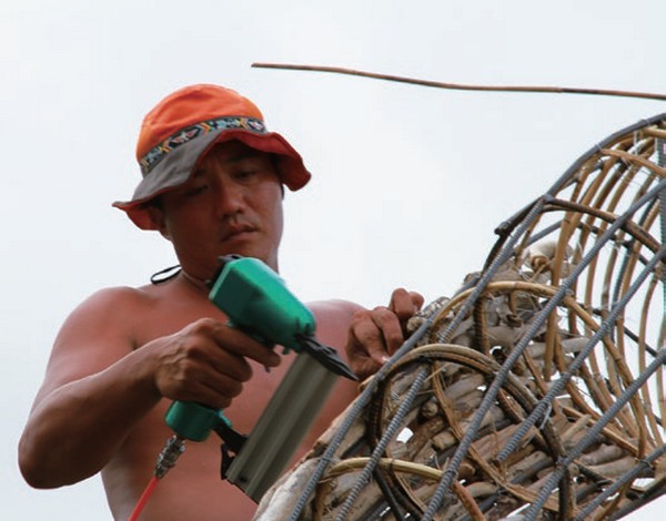 素材:將運材料:鋼筋、水泥、田土、棉線。利用鋼筋水泥建 構主架構、田土形塑造型,棉線裝置造型等製作工法。