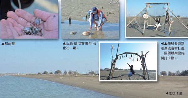 在陳船長帶領下,旅客將在沙洲上認 識潮間帶生物,不論是各類和尚蟹類、螺 類,或是存活億年的活化石─鱟,都將在 詳細的解說下,汲取豐富的生態知識。 除此之外,陳船長更在沙洲上利用漂流 木搭了一些場景提供拍照,不論是海廢鞦 韆,或是沙灘排球等,都格外充滿趣味。