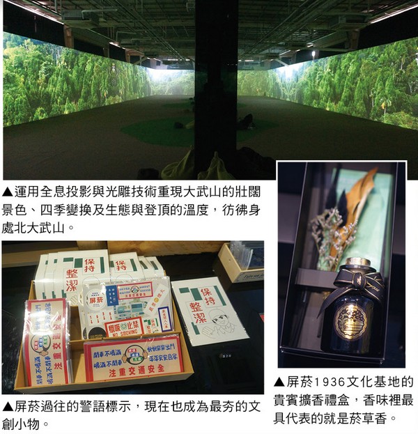 遊程從今年最新開幕的屏菸1936文化基地開 始,進入屏東菸葉廠原址,多媒體影音呈現就像 走入菸葉廠的興衰與歷史的時光隧道,之後再走 訪客家館,以數位科技介紹六堆人文地產景與未 來願景,接著重頭戲大武山特展,進入館內是沉 浸式的五感體驗,運用全息投影與光雕技術重現 大武山的壯闊景色、四季變換及生態與登頂的溫 度,彷彿身處北大武山,最後是故宮的魔幻山水 歷險展,運用AR科技與民眾互動方式深入介紹經 典畫作,園區各館帶給民眾的都是一種文化新體 驗,未來該園區預期成為屏東熱門新景點。