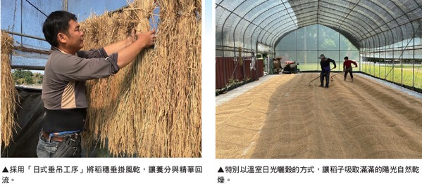 有了好品種的米,經過用心耕耘,收成後的曝曬更是一絕!兩大堅持,一是堅 持在農田旁搭建「日光溫室」,用呵護的 心搭配季節日照長短與濕度,定時翻曬收 成的稻子;二是將稻米參考「日式垂吊工 序」改良,將割取下來的稻桿,夾著稻粒 綁成束,倒掛在架上,讓米粒自然風乾, 時間約10~15天。
