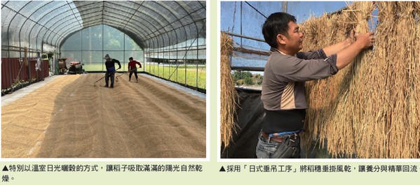 有了好品種的米,經過用心耕耘,收成後的曝曬更是一絕!兩大堅持,一是堅 持在農田旁搭建「日光溫室」,用呵護的 心搭配季節日照長短與濕度,定時翻曬收 成的稻子;二是將稻米參考「日式垂吊工 序」改良,將割取下來的稻桿,夾著稻粒 綁成束,倒掛在架上,讓米粒自然風乾, 時間約10~15天。