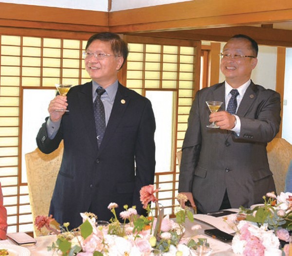 ▲西拉雅國家風景區管理處處長徐振能、台南應用科技大學校長黃宗成攜手賓客一起與日方連線。