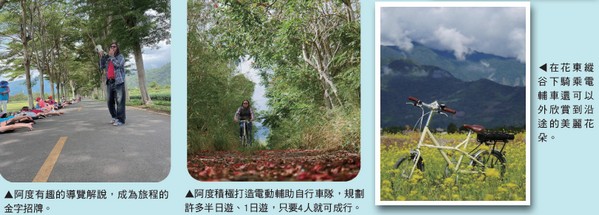 有了如此成功的導覽解說特色, 阿度也希望可以創造一個導覽解說人 員的訓練平台,提供導覽解說人員就 業機會,因此他積極打造電動輔助自 行車隊,規劃許多半日遊、1日遊, 只要4人就可成行,或是把兩個1日 合併成2日遊,導覽解說人員在疫情期間就 有工作機會,也能讓解說人員從小團開始帶 起,重新再學習、劇本化,就不會見人說人 話,見鬼說鬼話,努力傳達導覽解說核心思 想,把導覽變成戶外的相聲,提高旅客聆聽 的意願。