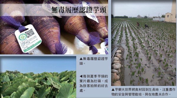 吳倢葇表 示,台灣曾經 遇到多次的食 安風暴,讓人吃得不安心,因此芋樂大世 界將食材回到生長地,注重農作物的安全 與管理栽培,與在地農夫合作,製作產銷 履歷班溯源碼,取得ISO認證,確保餐廳使 用的原物料都是跟有機農場合作,讓消費 者吃得更有保障。其中,2018年取得台中 市政府頒發的《傑出服務創新獎》(產業 再造低碳飲食風潮),服務小農的一級生 產,結合芋樂大世界二級加工,讓芋頭變 成蜜芋頭,將商品提供給農夫在小農市集 銷售,銷售期間更長,旅客可以吃到不同 風味的芋頭,小農也能獲得利潤,達到6 級化產業三贏的局面。