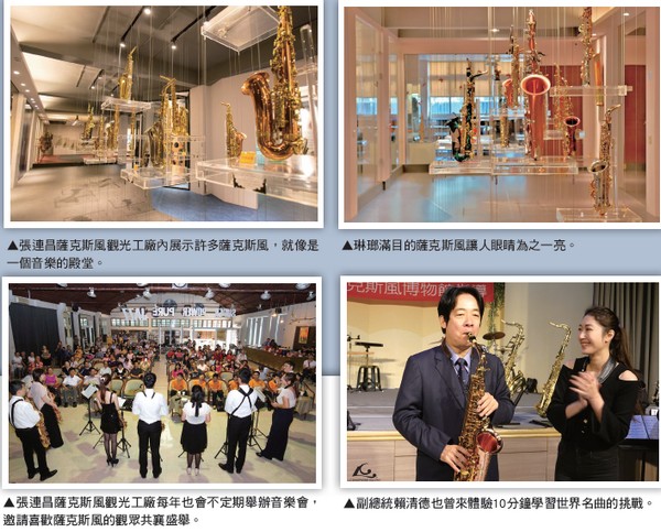 進入張連昌薩克斯風博物館,彷彿進入一 座美麗又動人故事的音樂殿堂,帶領旅客回 到70多年前音樂迴廊,呈現張連昌先生早期 製作樂器的心路歷程。耳際不時傳來鏗鏘有 序的節奏,竟是400個零件的生產線,讓旅 客一窺精湛工法,耀眼奪目的薩克斯風反覆流串在師傅的手指間組裝,最後成為精美的 薩克斯風,讓人嘖嘖稱奇。