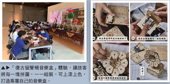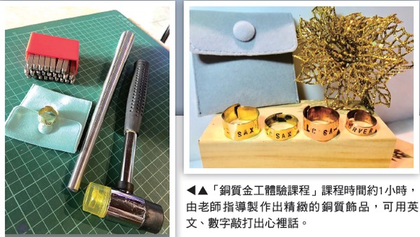 另外一個就是「銅質金 工體驗課程」課程時間約1 小時,由老師指導製作出 精緻的銅質飾品,可用英 文、數字敲打出心裡話, 將這份禮物送給自己,打 造屬於自己別具意義的紀 念性金工戒指。最後一個 則是「復古留聲機音樂 盒」將每一塊拼圖,一一組裝,可上漆上 色,打造專屬自己的音樂盒,相當適合低 年級的小朋友參與。