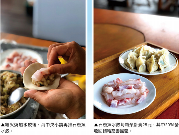 石斑魚水餃內餡的主食材龍膽石斑, 由西濱商圈產業觀光協會理事長黃立祥提 供,海中央小舖的媽媽們手工包水餃,餡 料有:石斑魚肉、高麗菜、蔥、薑及有提 鮮作用的豬肉包進水餃皮,再捏出漂亮摺 痕,每一個環節都細心處理。石斑魚水 餃,每顆預計賣25元,其中20%的營收將 回饋給慈善團體,開賣後如果市場反應良 好,之後會轉而成為他們的常態商品。