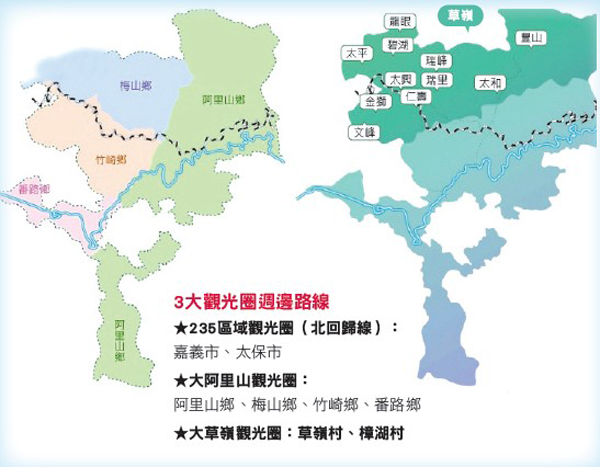 說到大阿里山地區,擁有豐沛的旅遊 資源,為了更貼近地方產業與旅 宿觀光、商圈結合發展,結盟成觀光圈 齊力推廣已是顯學,交通部觀光局阿里 山國家風景區管理處也積極串連轄區內3 大觀光圈推陳出新,規劃團客新遊程, 感受創新遊程魅力。3大觀光圈包含大阿 里山產業聯盟(2019/3成立),以精 緻、小眾、深度的概念,打造了茶、咖 啡、鐵道、原民、生態、浪漫等六個主 軸;235區域觀光圈(2020/7成立), 以北回歸線穿越嘉義縣市,從都市型態延 伸到阿里山地區,同時善用阿里山林鐵資 源,與木都特色,暢遊嘉義;大草嶺觀 光圈(2020/7成立)橫跨了雲林古坑樟湖、草嶺到阿里山與瑞里風景區,呈現更為原始自然的 峭壁雄風與地 質景觀,搭配 草嶺農特產美 食,形朔出極 具觀光風貌的 旅遊板塊。