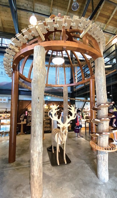 ▲ 穹頂木音琴運用軟硬比重不同的木種精心調音,當木球滾 下一階又一階琴鍵上,自然舞出優美的旋律。