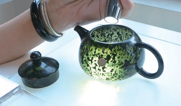 台灣墨玉出土時為白色,拋光之後變成 黑色,在光的照射之下才會透出墨綠的光 彩,其中的台灣墨玉 莫氏硬度是7,黑色 磁鐵礦為5.5,軟硬不 一的情況之下,雕刻 時容易凹凸不平,必 須透過藝術家的巧手 慢慢雕刻。因此相同 的杯子卻有口徑不一 樣,或是裝飾吉祥物 的大小不等的情況, 也讓作品在雕刻的過程中容易失敗,造就 工藝商品價格不斐的主要原因。而旅客來 到台灣黑土傳藝店,雖然沒辦法進行困難 的雕刻,卻能體驗拋光的樂趣,採用軟式 砂輪機,一層砂紙一層菜瓜布,讓小朋友 也能輕鬆安全上手。