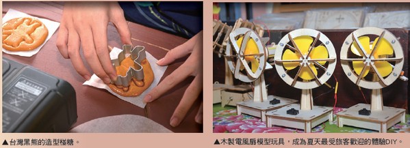 五姨婆手作客棧負責人何飛達表示, 五姨婆是傳藝中心唯一提供多樣手作DIY 課程的體驗中心,30多種的手作體驗分為 4大類型,有烹飪課、組裝課、彩繪課、 轉印課。其中烹飪課有韓劇《魷魚遊戲》 最流行的造型椪糖,以及傳統的椪糖、黑 糖糕、狀元糕、畫糖。組裝課則是讓孩 子動腦,把木片組合成模型搭配動能與機 械原理,讓恐龍、戰車、飛機等模型可以 動,更加有趣。最特別的是,還有夏天必 備的木製電風扇。