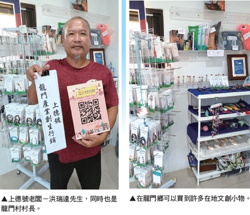 位於湖西鄉的「上德號」,是當地洪 家祖父輩留下的傳承事業,一開始沒有特 別命名,以服務在地居民,提供民生用品 買賣為主。繼承到現在的洪瑞達老闆,同 時也是龍門村的村長,由於看準文創崛起 的趨勢,與龍門創生行銷中心共同合作, 發展出許多文創商品與開發週邊新興旅遊 景點,在上德號就可以購買到許多澎湖文 創商品。龍門創生行銷中心也與村長合作 海廢物創意再生,由村長號召80位環保義 工,清理龍門村長約一千公尺海岸線的海 漂廢棄物,巧手加工再製,除 了製做出一尾放置在龍門環保 公園內、村民口稱「幸福魚, 魚躍龍門」的鯉魚外,還有不 少浮球藝術品及文創商品,讓 遊客可以看見在地居民的用 心,留下美好的旅遊回憶。