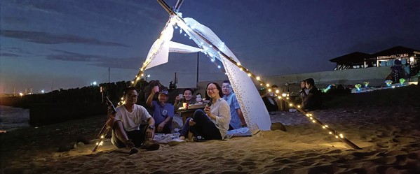 ▲旅客在龍門晚宴後在沙灘上享受夏日晚風輕拂。