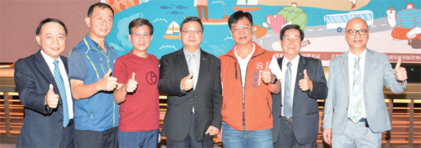 ▲(左起)高雄市旅館商業同業公會理事長周文彬、台灣六堆觀光產業發展協會理事長吳文豪、高雄旅行商業同業公會理事長蔡宗佑、觀光局局長張錫聰、高雄市東高雄觀光產業聯盟理事長鍾兆淵、台灣星級旅館協會理事長蔡永興、高雄觀光圈盟主劉坤福。
