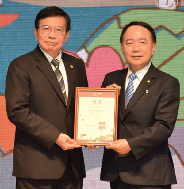 ▲高雄觀光圈副盟主(大高雄觀光商圈總會總會長)王文雄由代理人大高雄觀光商圈總會輔導總會長劉昭智(右)上台受證。