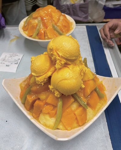在玉井農會大樓斜對面的「有間冰 舖」,最知名的莫過於芒果無雙,店 家將芒果打成之後急速冷凍,形成芒 果冰磚,然後鋪上一層芒果片,淋上 芒果果肉泥後,並添加情人果與兩球 芒果冰淇淋,造就一碗視覺與味覺都 是饗宴的美味。