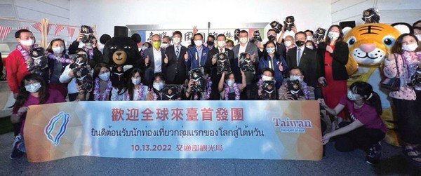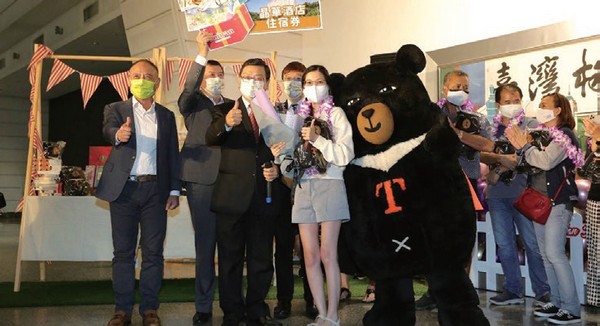 ▲台灣於10/13正式重啟邊境,交通部觀光局局長張錫聰特別率隊歡迎首批抵台的疫後國際旅客。