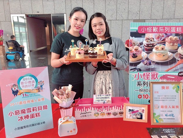▲ 陳汶萱與妹妹合影。小惡魔雪莉貝爾冰棒蛋糕獲得2017年最佳現場人氣獎。