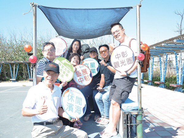 ▲中彰區域觀光聯盟舉辦《進「彰」趕「烤」藝「蚵」狀元》的考察團,邀請產業代表看建彰化濱海旅遊特色。(後排左起)台灣旅行業國民旅遊發展協會理事長蔡子建、旅奇傳媒總裁何昭璋、旅美藝術大師蔡爾平、中彰區域觀光聯盟副總召集人吳世長、中華兩岸旅遊產學發展協會理事長齊雁蘋、中彰區域觀光聯盟計畫主持人吳政和、在地導覽解說員粘清課、台灣旅行業國民旅遊發展協會創會理事長朱永達、中區甲聯會會長張文姬、台灣入境旅遊協會理事長王全玉、交通部觀光局參山國家風景區管理處遊憩課王茗甄。