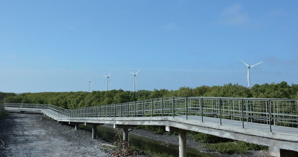 親近潮間帶生態的海空步道,擁有觀夕平台、賞鳥亭及底棲環境觀察平台,沿著海空步道走至芳苑海堤,將能一次飽覽紅樹林、潮間帶與濱海生態環境等美好風光。