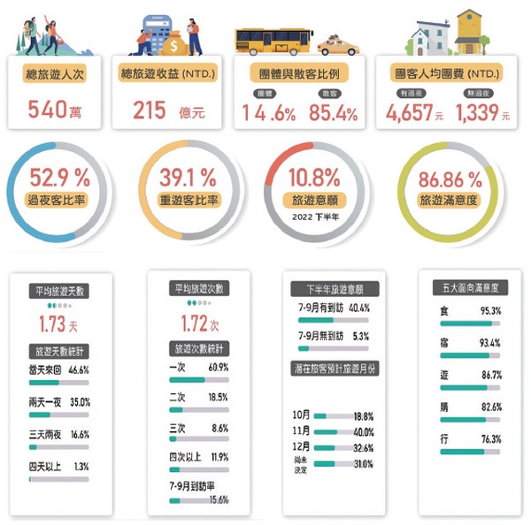 然調查中也指出,由於旅客的爆量增長,但疫情造成的服務人員流失尚未補足,兩相牴觸下使得滿意度僅達到86.86%,相較於上半年的92.3%略為下滑,但在食、宿方面依舊維持超過9成的滿意度,日月潭觀光圈聯盟也將針對觀光產業高度缺工等問題,作為未來強化的重點之一。