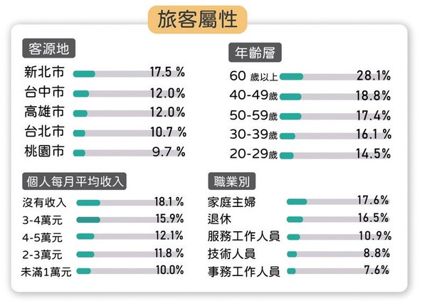 在旅客屬性方面,造訪日月潭觀光圈的民眾過去多以中台灣鄰近縣市的客群為大宗,但此次統計中能看見,包括新北、台中、高雄、台北等都有達到10%以上的占比,桃園則以9.7%緊追其後,顯示出外縣市到訪的旅遊意願逐漸回溫,尤其北部縣市的旅客占比大幅提升,展現出聯盟在北台灣投遞於公車車體、站亭、捷運燈箱等戶外廣告取得成效,成功達到精準行銷。