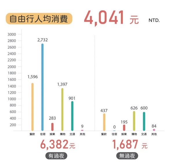 值得一提的是,自由行的消費金額此次略為下降,過夜旅客達到6,382元,無過夜則為1,687元,根據聯盟統計後發現,主因在於政府的旅遊補助,以及業者釋放的優惠相互搭配下,使得旅客出遊成本降低,也是刺激旅客到訪的原因之一。