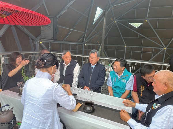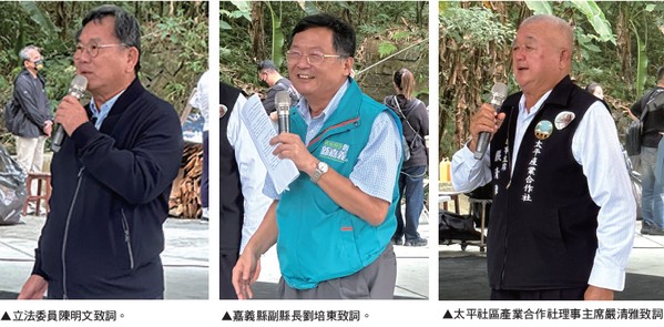 ▲(左起)太平社區產業合作社理事主席嚴清雅、無二窯藝術空間創作者王文志、嘉義縣副縣長劉培東、立法委員陳明文、水土保持局副局長林長立、阿里山國家風景區管理處副處長陳榮欽。