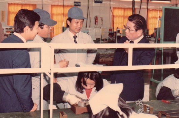 ▲1981年日本三協高層人員巡視協櫻生產現場,由時任技術課課長的現任總經理黃龍溪(左3)接待說明。