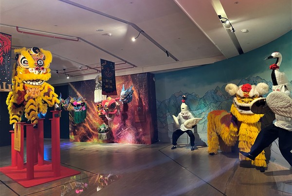 ▲展區中醒獅踩高樁立體裝置,呈現出舞獅精湛的技藝,以及踩高樁向下探的躍動感;而北港媽祖出巡繞境才會出陣的北港老塗獅白鶴陣,則展現糊紙工藝、傳承傳統獅頭造型。