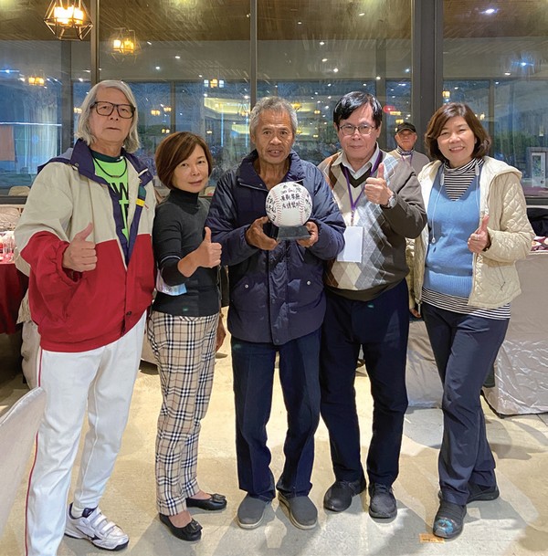 ▲台灣旅遊聯盟總召集人陳照明(左1)萬海旅行社董事長吳榮枝(左4)、三貿旅行社總經理藍雪花(左5)致贈紀念禮給洄瀾灣景觀餐廳老闆娘楊麗華(左2)、老闆黃枝成(左3)。