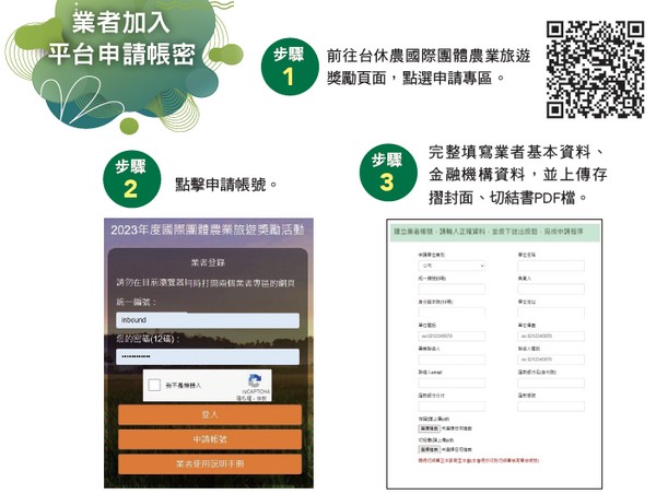 !凡國外旅客在11/30前,至適用農業旅遊點進行門票、體驗活動、田園餐飲或休閒農場住宿等消費並符合獎勵條件者,將會給予每團每人最高750元的獎勵,且不分平假日皆可申請。團體申請的條件為每團人數至少6人以上,在體驗類的農遊點平均每人消費250元以上,獎勵250元,項目限額為45,000人;住宿類則是在農遊點住宿1晚,獎勵500元,項目限額為25,000人。此次補助規定每家旅行社在體驗類以1,000人次為限,住宿類則是500人次,設有分公司的旅行社則可在體驗類增加100人、住宿類50人。