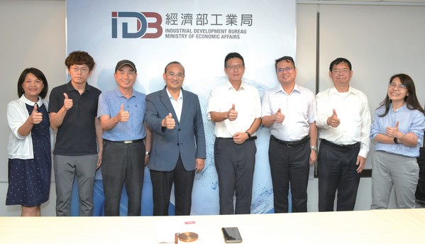▲(左起)工業技術研究院產品經理蔡秀如、經濟部中部辦公室第一科技士梁嘉晉、視察許世燦、經濟部工業局局長連錦漳、知識服務組科長陳全政、永續發展組科長賴俊甫、知識服務組技正陳宏斌、中衛發展中心生活產業部協理林孟麗。