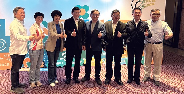 ▲(左起)花蓮縣觀光協會理事長陳義豐、東部海岸國家風景區管理處處長林維玲、台東縣縣長饒慶鈴、交通部部長王國材、立法院委員劉櫂豪、交通部觀光局局長張錫聰、花蓮縣觀光處處長張志翔、花東縱谷國家風景區管理處處長郭振陵。