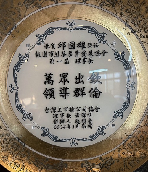 ▲慶賀AI茶產業發展協會理事長邱國雄擔任首屆理事長紀念物。