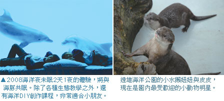 自從小水獺「皮皮」從台北木柵動物園來到花蓮之後,馬上成為園內的新明星。在園方安排的新居外,遊客圍成一個圈,爭相目睹兩個小傢伙打情罵俏的模樣。牠們的聲音、動作都像小孩一樣活潑又可愛,是在場鎂光燈的焦點。園內最受歡迎的表演節目—晃晃海獅秀,也總是可以吸引滿場的觀眾。在場不論年紀、不問性別,全部陶醉在驚奇的表演與流利的串場中。此外,位於水晶城堡,斥資千萬的魔幻大秀「飛越海洋」,與國外舞者、劇團合作,加上舞台特效與特技,規模有如欣賞一場紐約百老匯表演。值得一提的是,遠雄海洋公園綜合園區特色, 全年推出的「2008海v夜未眠」2天1夜活動,透過在園內過夜的方式,可以看到夜行性海洋動物的不同面貌,與海豚一起入夢,是新奇又難得的體驗。