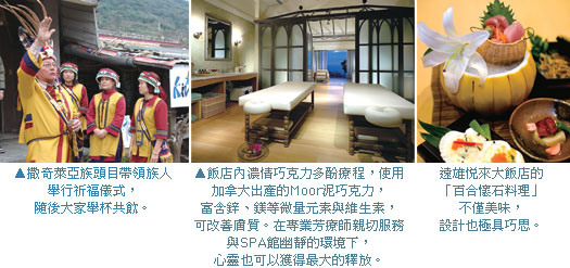 由於4~6月正值花東地區的飛魚祭,該行程除了可以體驗撒奇萊亞族傳統的捕魚技法之外,還可以品嚐由部落頭目夫人Kiniw媽媽獨家的飛魚料理以及其他風俗菜餚。隨著時令,遠雄悅來大飯店內的秋草日式料理廳也準備了「百合懷石料理」,一共7道創意美食,搭配BELLE SPA館的濃情巧克力多酚療程,打造完美的東海岸渡假之旅。